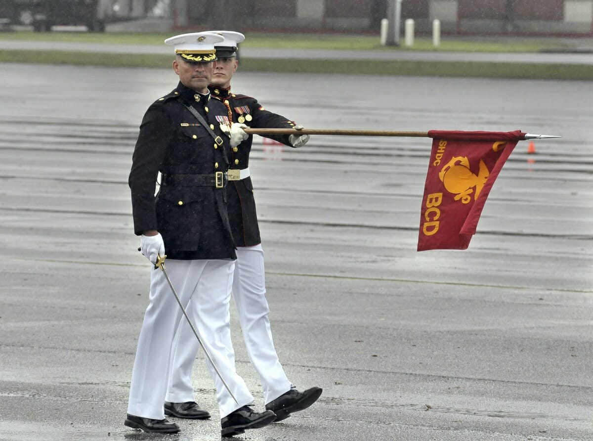 Silent Drill Platoon. April 8, 2015 Silent Drill Platoon. Major Christopher Hall, left,, commanding officer of the U.S. Marine Corps’ Drum and Bugle Corps, passes in review at Marine Corps Recruit Depot Parris Isand. Share this Facebook Messenger Twitter Pinterest Whatsapp Email newsbyte Leave a ReplyYour email address will not be published. Δ