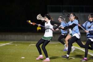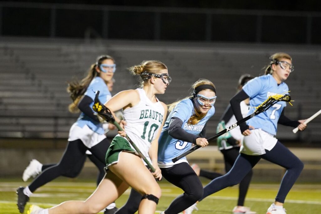 Beaufort High’s Emma Hooper tries to outrun her opponents during the girls lacrosse season opener against Pinewood Prep at Beaufort High School on Monday, Feb. 23, 2026.