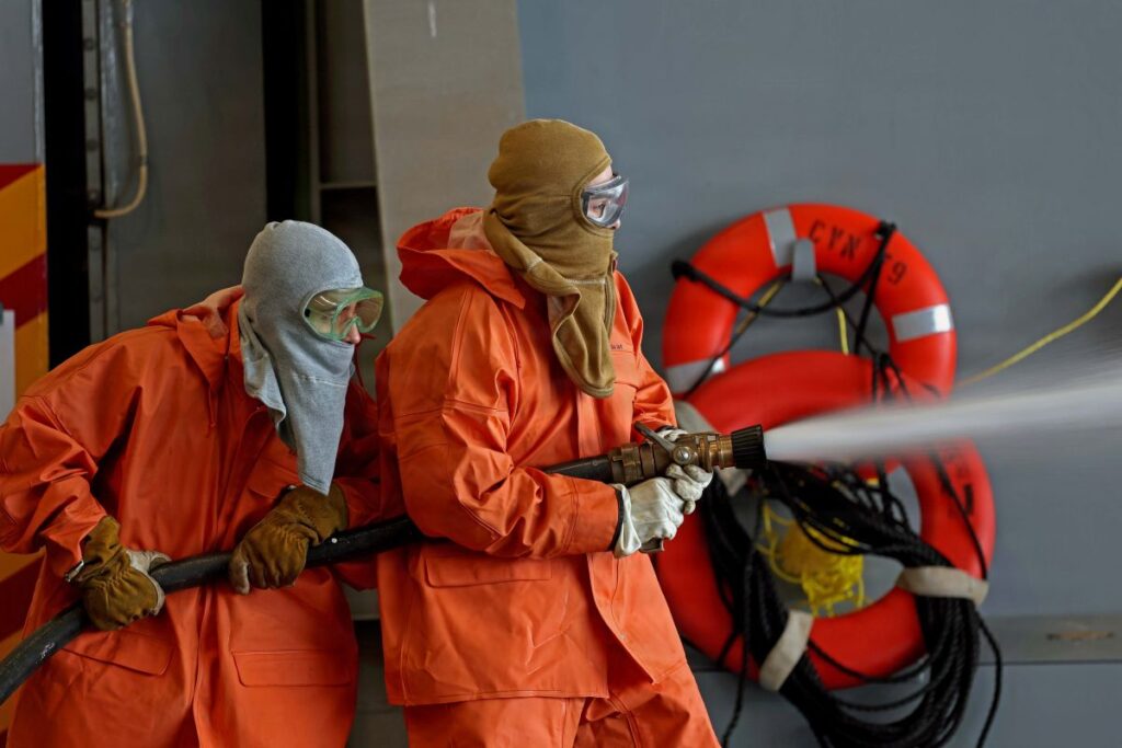 Damage Control Fireman Musrasrik Tulensru, left, from Kona, Hawaii, and Damage Control Fireman Nathaniel Gallego, from Beaufort, S.C., both assigned to Engineering Department aboard Pre-Commissioning Unit John F. Kennedy (CVN 79), test an aqueous film forming foam (AFFF) hose in the hangar bay during Builder’s Trials on Saturday, Jan. 31, 2026.
