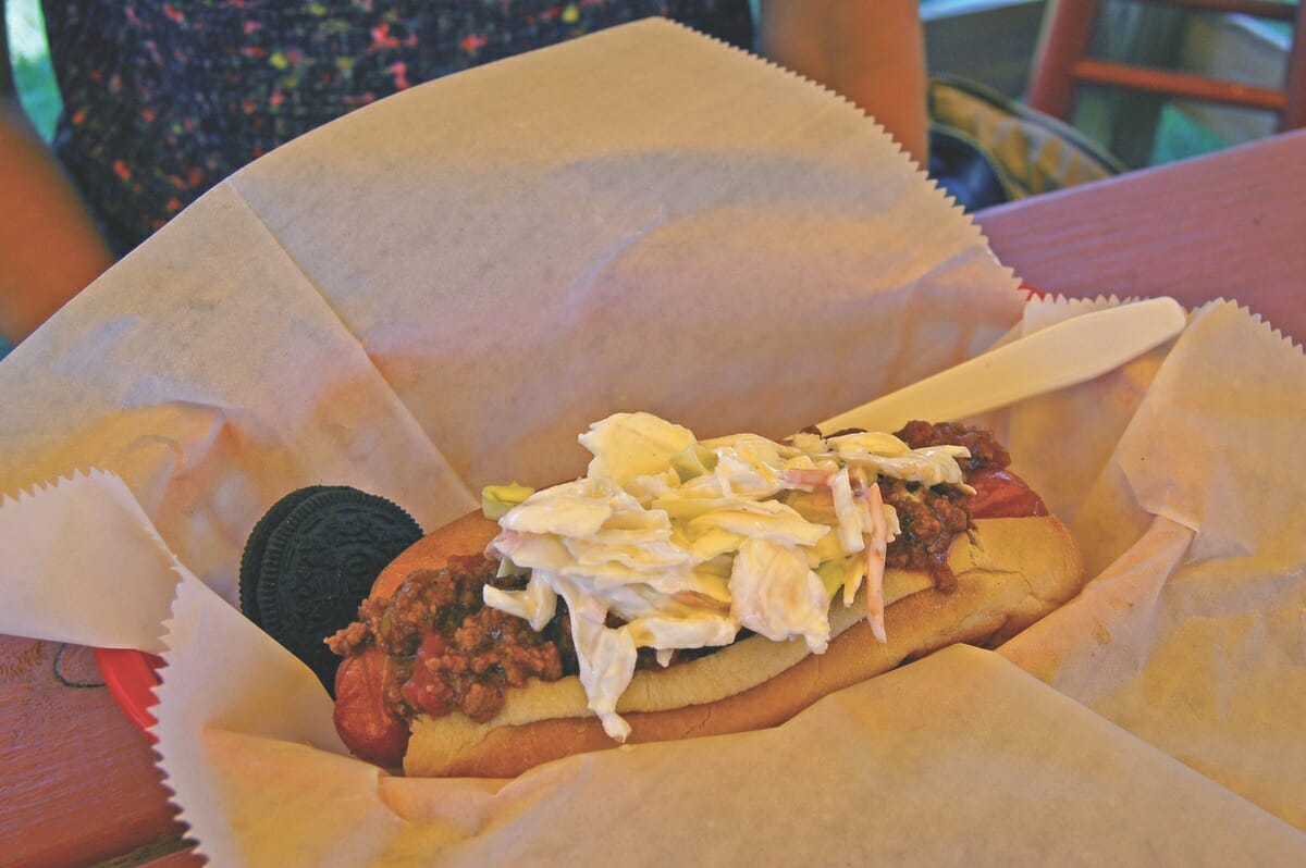 But as you get closer, you’ll have no problem spotting The Dog House. The fluttering flags draw your attention, and as you drive up you’ll see the bright umbrellas over the red outdoor picnic tables. This is super-casual dining, after all.