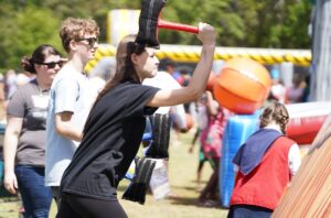 Sage Wilson and Ethan Deloach, both from Beaufort, throw axes in a game at Eggstravaganza 2026 on Saturday, April 4, 2026, at Community Bible Church in Beaufort. Amber Hewitt/The Island News