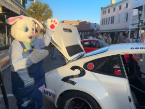 The Easter Bunny is excited to see the car show during the First Friday event on Bay Street in Beaufort on Friday, April 3, 2026. Amber Hewitt/The Island News
