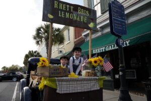 The young Rhett brothers, James, 3, and William, 6, sell lemonade during the First Friday event on Bay Street in Beaufort on Friday, April 3, 2026. Amber Hewitt/The Island News