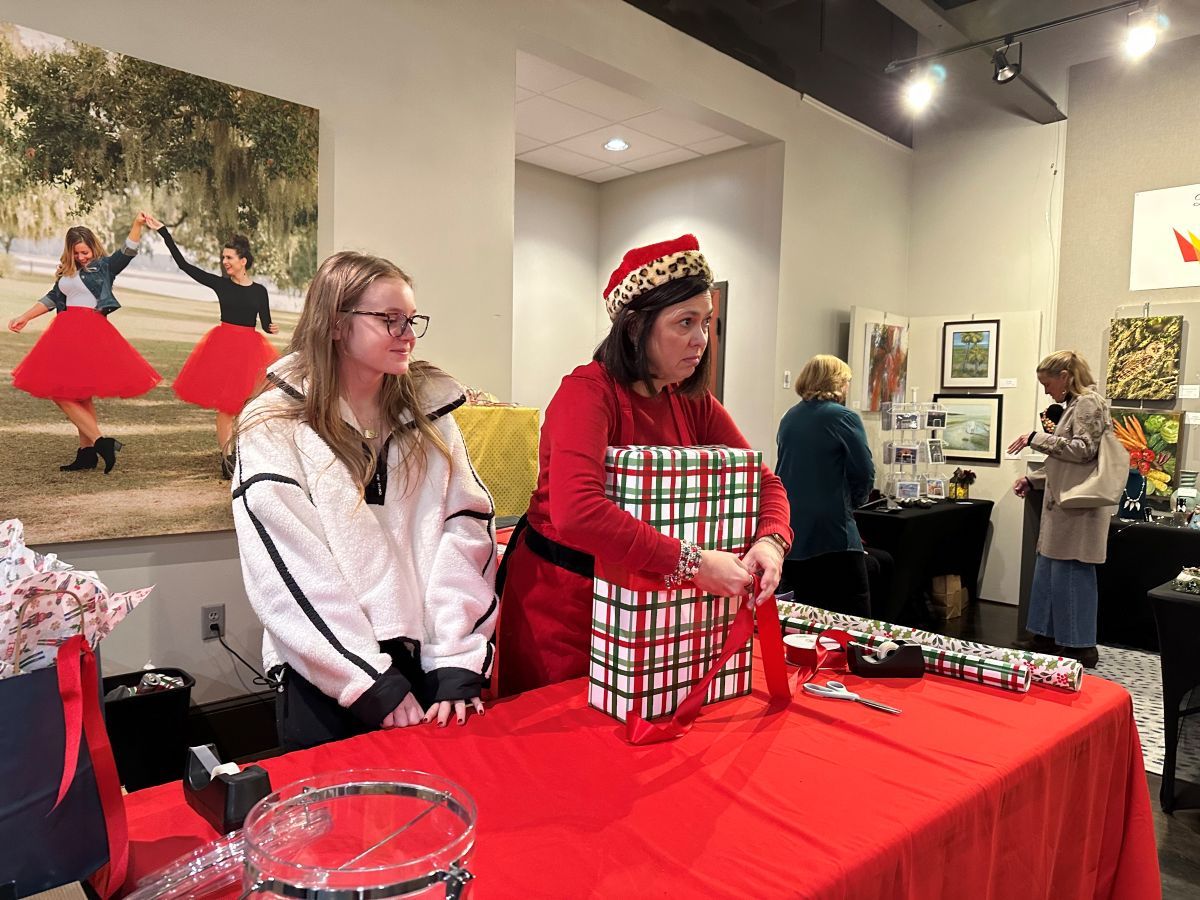 Volunteers wrap gifts at the complementary gift wrapping stations set up during opening day of the inaugural Mistletoe Market at Tabby Place at The Beaufort Inn on Thursday, Dec. 11, 2025. Amber Hewitt/The Island News