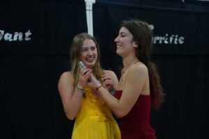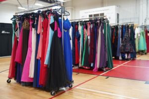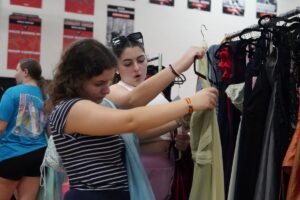Iris De bois and Léane Brunet Garcia, both foreign exchange students from France, try on dresses during the Junior Service League of Beaufort Prom Boutique held on Saturday, Feb. 21, 2026.
