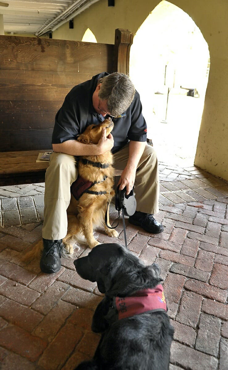 Top photo: Patrick Wyatt, a disabled U.S. Marine Corps Veteran, reassures his dog “Princess” prior to the start of the scavenger hunt.