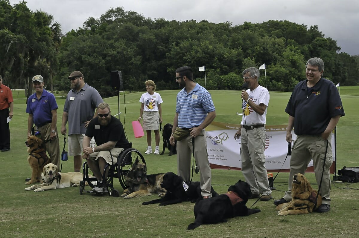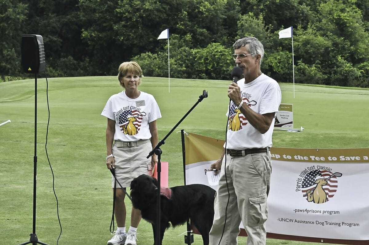 Paws4Vets provides trained assistance dogs for veterans who are suffering from Post-Traumatic-Stress Syndrome or having received severe physical injury in the service of our country. The golf tournament, with more than 80 players, began with the Battery Creek Marine ROTC honor guard presenting colors and the singing of the National Anthem. Miami and Shelly Phillips, organizers for these events then made the presentation of a check for $10,000 to Zachary Whisenhunt of Paws4Vets and then the tournament began.