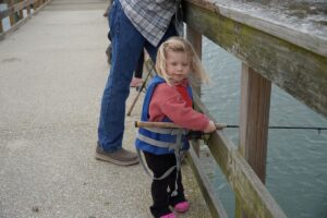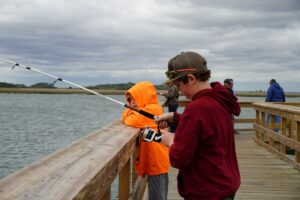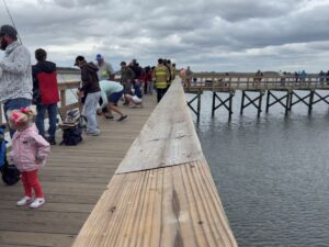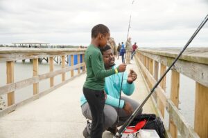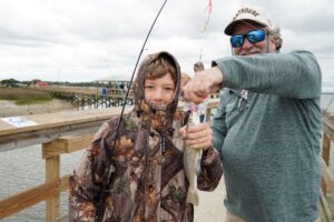 Leandre Ingram of Beaufort used the moment as a hands-on lesson, showing 7-year-old Myles how fiddler crabs work and encouraging him to gently touch one, helping him overcome his fear and bait the hook during the Junior Service League of Beaufort’s second annual Scales and Tails kids fishing tournament on Saturday, March 28, 2026, at The Sands boardwalk in Port Royal.