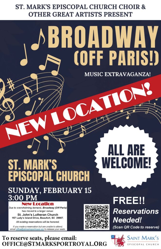St. Mark’s Episcopal Church is hosting the Broadway (Off Paris!) choral extravaganza at 3 p.m., Sunday, Feb. 15. Due to overwhelming demand for seats, the event has a new location: St. John’s Lutheran Church, 157 Lady’s Island Drive in Beaufort.